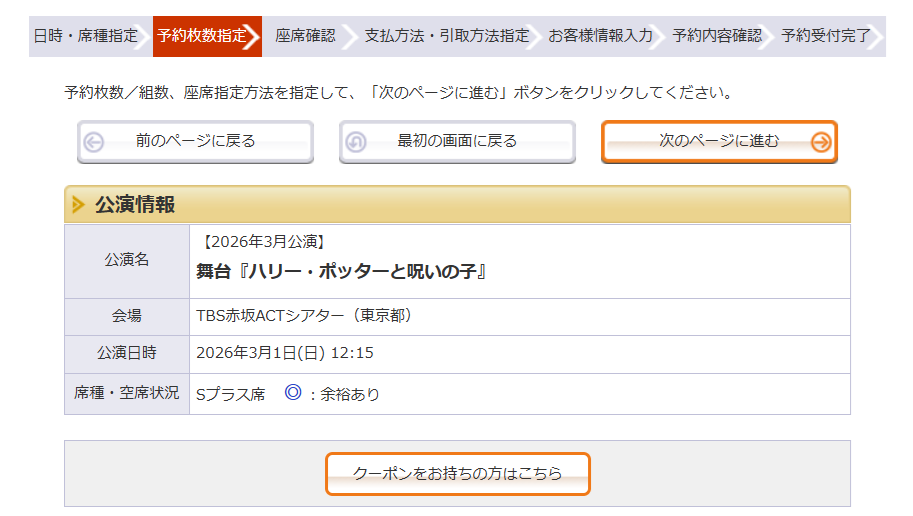 クーポン対象座種:Sプラス席、Sプラス席(6歳~15歳)S席、S席(6歳~15歳)