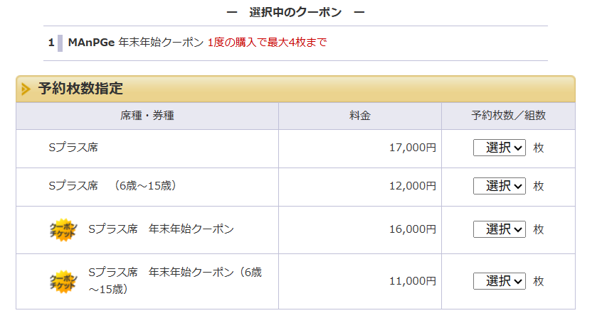 ③ご購入席種の予約枚数指定画面で「クーポンをお持ちの方こちら」にクーポンIDを入力すると割引価格が表示されます。