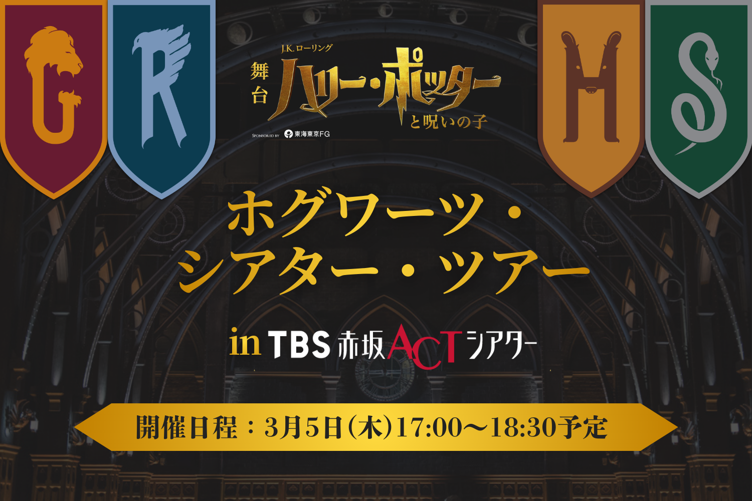 2026年3月5日(木)、TBS赤坂ACTシアターにて、舞台『ハリー・ポッターと呪いの子』の世界観をより深く、多角的に楽しむことができる体験型イベント「ホグワーツ・シアター・ツアー」の開催が決定いたしました。本イベントは、ファンの皆さまへの日頃の感謝を込めて、TBSチケットまたはホリプロステージで2026年1月〜7月公演のチケットをご購入いただいた方の中から、抽選で200名様を無料でご招待します。当日は、ホグワーツの生徒たちによる迫力のパフォーマンス「ワンドダンス」披露や、専用劇場ならではの魅力を解説するトークショー、普段は立ち入ることのできない「舞台上」での記念撮影、物語を彩る小道具・衣裳の“触れる”展示など、本公演のこだわりを体感できる充実のプログラムをお届けします。
