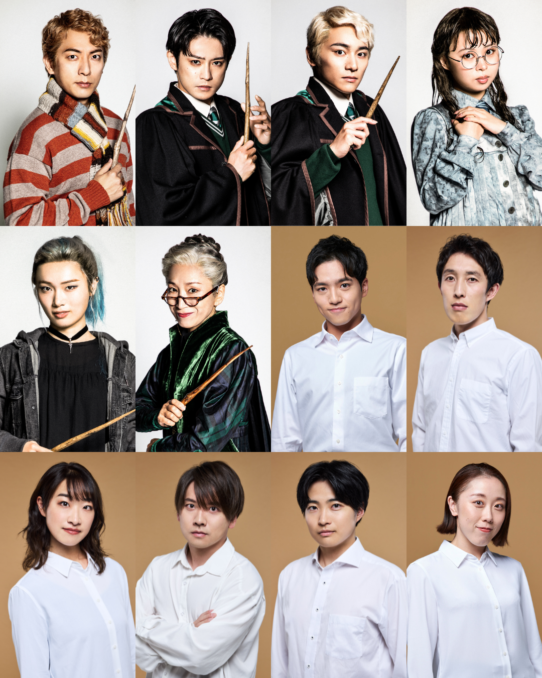 (上段・左より)ロン・ウィーズリー役:上山竜治、アルバス・ポッター役:原嶋元久、スコーピウス・マルフォイ役:大久保 樹、嘆きのマートル役:出口稚子(中段・左より)デルフィー役:乃村美絵、マクゴナガル校長役:白木美貴子、秋山和慶、チョウヨンホ(下段・左より)隼海 惺、久道成光、星 郁也、森田万貴