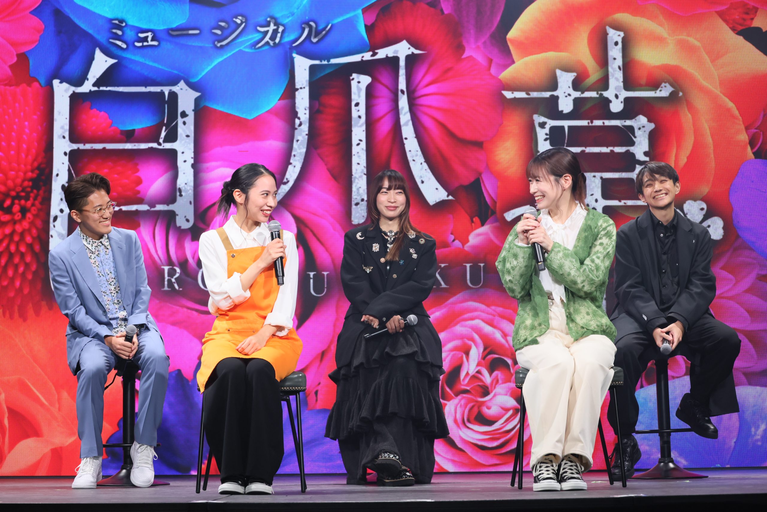 左から)脚本・歌詞原案:福田響志、白椿 蒼役:屋比久知奈、音楽・歌詞:ヒグチアイ、白椿 紅役:唯月ふうか、演出:元吉庸泰