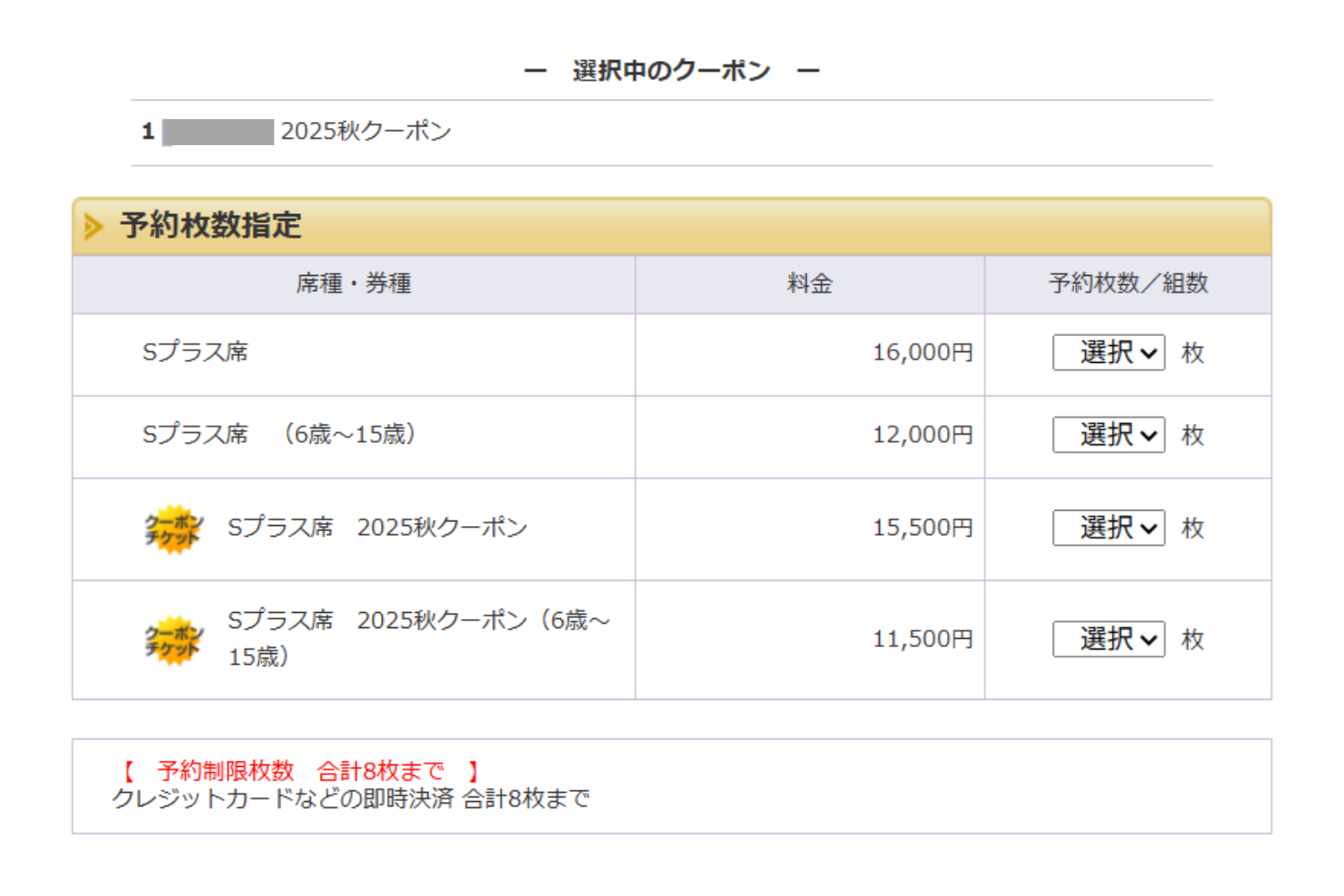 Sプラス席、Sプラス席(6歳~15歳)、S席、S席(6歳~15歳)